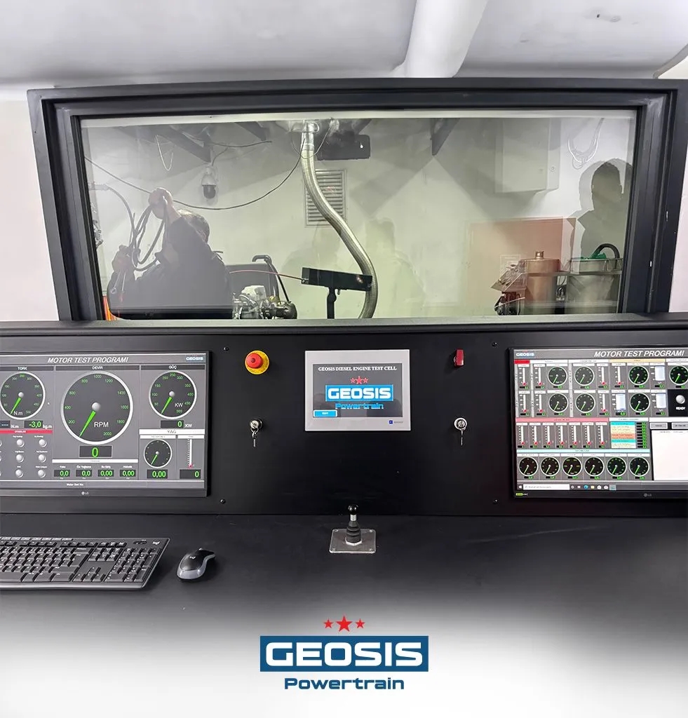 Geosis Powertrain Motor Test Ünitesi Bölümünde tüm taktik tekerlekli araçların motor bakım, onarım, yenileştirme işlemleri sonrası uzman ekibimiz tarafından Motor Güç, Tork, Yağ Sıcaklık, Basınç, Yakıt Tüketimi, Egzoz Sıcaklığı ve Hava Emme Basınç testlerine bakılarak ve son teknolojiye sahip Motor Test Ünitemizde (Bremze) test yapılarak teslim edilmektedir